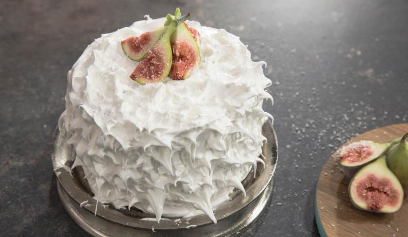 Bestreiche die Torte rundherum mit dem Frosting und verziere es mit dem Muster deiner Wahl. Bestreue die Torte mit Kokosraspeln und dekoriere sie mit Feigen. Stelle die Torte bis zum Servieren schön kühl, so kann alles gut durchziehen und das Frosting wird wieder etwas fester.