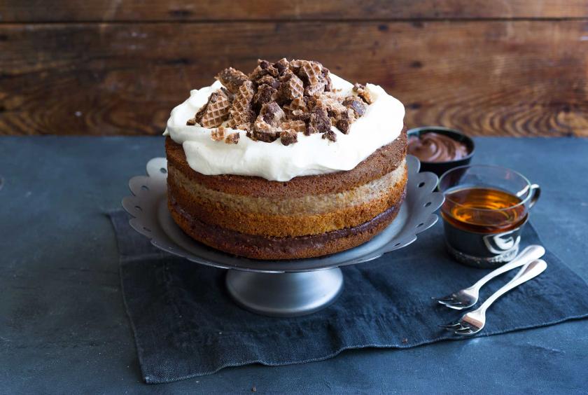 Hacke die Hanuta für die Garnitur in grobe Stücke. Streue sie auf die Sahne. Schneide die Torte und serviere sie.