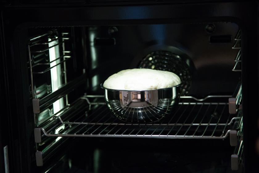 Butter schmelzen und leicht abkühlen lassen. Milch lauwarm erwärmen, Hefe darin auflösen. Mehl, Zucker und 1 TL Salz mischen. Milchmischung dazu geben und alles mit den Knethaken des Handrührgerätes oder der Küchenmaschine zu einem glatten, geschmeidigen Teig verkneten. Abdecken und an einem warmen Ort ca. 60 Minuten gehen lassen. Dafür kannst Du zum Beispiel auch die Gärstufe des Bosch-Backofens wählen, denn im 30-40 Grad warmen Ofen und etwas Dampf kann der Hefeteig am besten gehen.