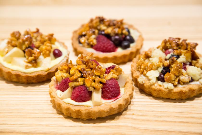 Nach der Kühlzeit den Teig dünn ausrollen und auf 12 Tarteletteförmchen verteilen. Die überstehenden Ränder abschneiden. Die Tartelettes mehrfach einstechen und blind backen. Dafür im vorgeheizten Backofen zuerst für 8 Minuten bei 220 Grad 4D Heißluft, danach für weitere 10 Minuten bei 180 Grad backen. Dann komplett auskühlen lassen.
