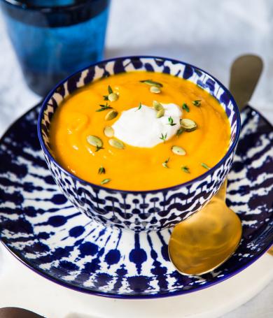Zum Auftauen die gewünschte Suppenportion über Nacht im Kühlschrank langsam auftauen lassen und am nächsten Tag erwärmen. Wenn es schneller gehen soll und dich der Hunger spontan überkommt, kannst du es wie ich machen und die Mikrowellen-Funktion des Bosch Sensor-Backofens der Serie 8 nutzen. Damit ist die Kürbissuppe ruckzuck aufgetaut.