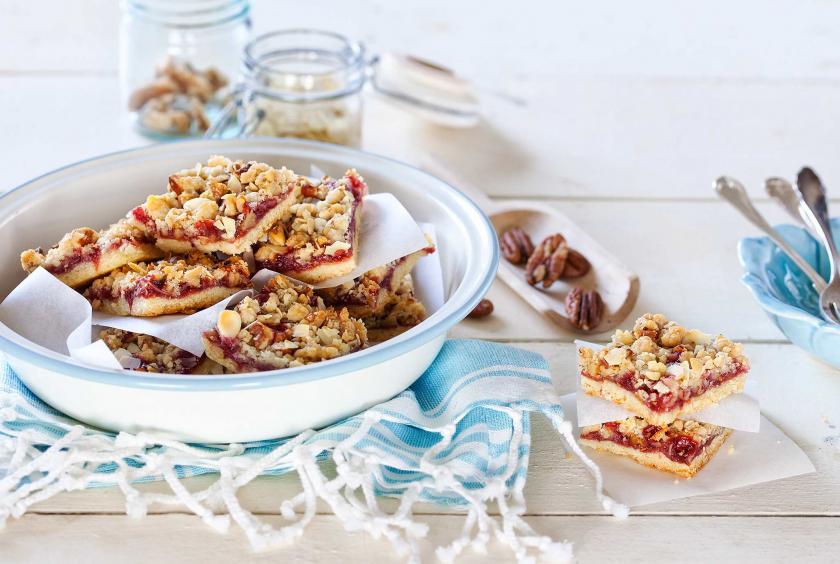 Feine Kuchenschnitten, die einfach alles können: Knackige Nüsse und buttrige Streusel treffen auf eine frisch-fruchtige Himbeerfüllung. Mit diesen Himbeerschnitten werden süße Gaumen in himmlische Höhen versetzt.