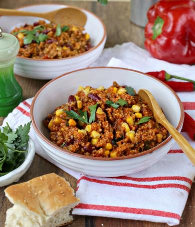 Unser Chili sin Carne mit Süßkartoffeln hast du in Windeseile zubereitet und es steht der Variante mit Fleisch in nichts nach. Der würzige Klassiker kommt mit Kidneybohnen und Mais daher. Mit Crème fraîche, Tortilla Chips und Avocado rundest du das vegetarische Chili sin Carne mit Süßkartoffel ab.