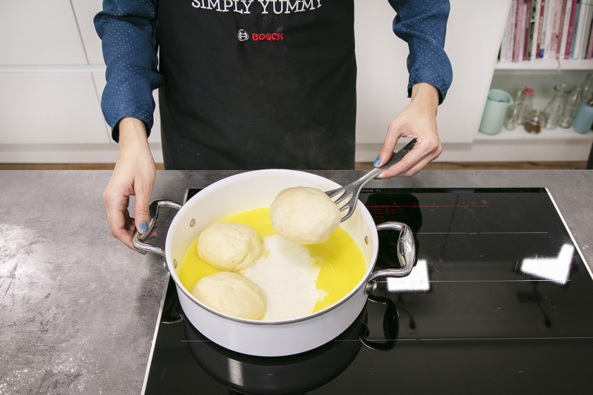 Nachdem mir Mama am Telefon erklärt hat, wie man Dampfnudeln kocht bzw. dämpft, hätte ich fast das Handtuch geworfen. Ganz schön kompliziert, wenn man nicht das Bosch Kochfeld der Serie 8 zu Hause hat. "Bei kleiner Stufe köcheln lassen. Sonst brennt's an. Aber nicht zu klein. Sonst wird's nichts." Viel zu komplex. Ich habe einfach den PerfectCook Kochsensor an meinem Topf angebracht, Stufe 2 eingestellt und den Hefeklößchen beim Köcheln zugeschaut. Perfekt.