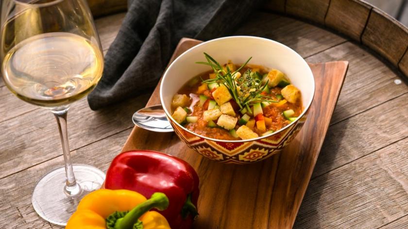 Zum Schluss noch ein bisschen Nerdwissen: Die Gazpacho Andaluz bestand ursprünglich nicht aus Tomaten oder Paprika, sondern ausschließlich aus Gurken, Brot, Knoblauch, Olivenöl, Essig, Salz und Wasser. Tomaten und Paprika kamen dann erst durch Christoph Kolumbus dazu. Klassisch wird die Gazpacho mit guarnición - also klein geschnittenem Gemüse - serviert. Mache ich bei meiner Suppe natürlich auch. Neben den Croûtons versteht sich.