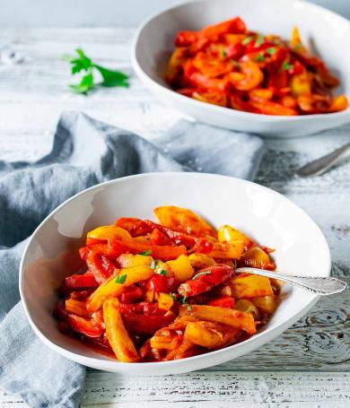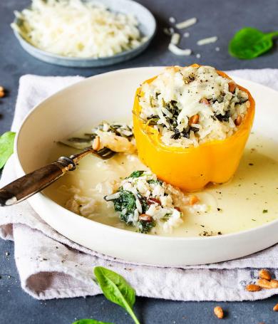 Übrigens höhle ich die Paprika immer im Ganzen aus. Das heißt, ich schneide den Deckel ab und entferne Kerngehäuse und weiße Fasern an den Paprikawänden. Anschließend die Füllung hineingeben, Paprika in eine Auflaufform stellen und passierte Tomaten angießen. Letztere dienen übrigens auch als Soße für das gefüllten Gemüse. Alternativ kannst du die Paprika auch längs halbieren. Dann hast du eine Art gefülltes Paprikaschiffchen. So wie bei dieser veganen Variante mit Falafel gefüllt. Dazu noch einen Joghurtdip oder veganes Tzatziki – perfekt.