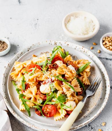 Der Mann wie gesagt auch. Vor allem seitdem es bei uns zu Hause diesen griechischen Nudelsalat gibt. Denn wenn er eine Sache noch mehr liebt als Oliven und Feta, dann ist das: Pasta. Und zwar in jeglicher Form. Die logische Konsequenz also, dass ich dem klassischen Bauernsalat etwas Italo-Flair einhauchen musste.