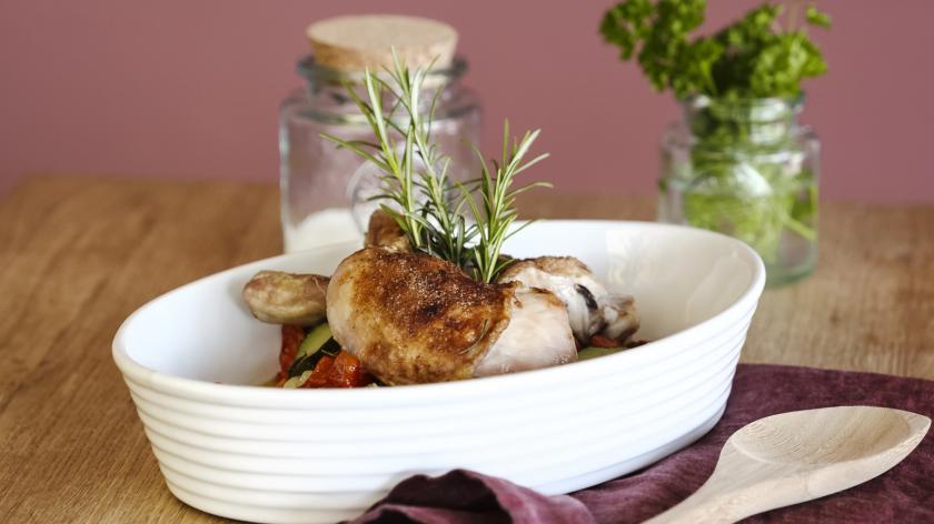 Das Rezept für Hähnchenkeulen mit Ofengemüse