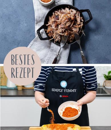 Die Mikrokombi Funktion meines Bosch-Backofens ist ein wahres Wunderwerk! Durch die Kombination von Mikrowelle und klassischer Backofeneinstellung werden die meistens Speisen viel schneller gar. Auch das beliebte Pulled-Fleisch ist ja normalerweise ein Gericht, das super lange im Ofen braucht, bis es wirklich zart ist. Das Pulled Chicken in diesem Rezept war sogar in unter einer Stunde fertig – zart und einfach perfekt! Klappt übrigens auch mit Schweinefleisch für den klassischen Pulled Pork Burger.