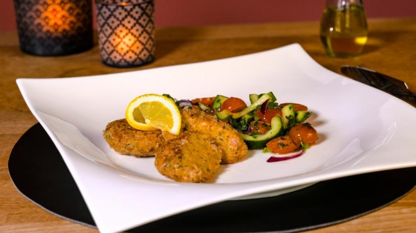 Bleiben nur noch das Formen und das Braten. Die Lachsfrikadellen vor dem Braten etwas platt drücken. Die Gefahr ist ja immer, dass sie außen schon knusprig, aber innen noch roh sind. So umgehst du diesen Fauxpas. In etwas Fett ausbacken - fertig. Und zwar wirklich.