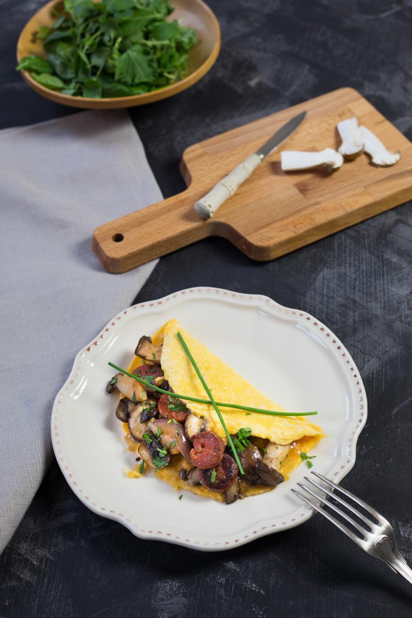 Egal ob zum Frühstück, Mittag- oder Abendessen – ein gut gemachtes Omelette schmeckt immer! Wenn es dann noch deftig gefüllt ist mit spanischer Chorizo und einer Pilzauswahl, die nach Wald schmeckt, dann ist die Mahlzeit perfekt und der Tag oder Feierabend kann beginnen. Die italienische Variante davon heißt übrigens Frittata.