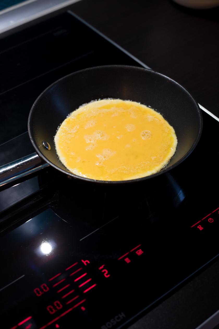- Verschlage die Eier mit dem Salz. Wenn Du vier kleine Omelettes möchtest, nimm am besten eine kleine Pfanne, für zwei große Omelettes ist eine normale Haushaltspfanne perfekt.