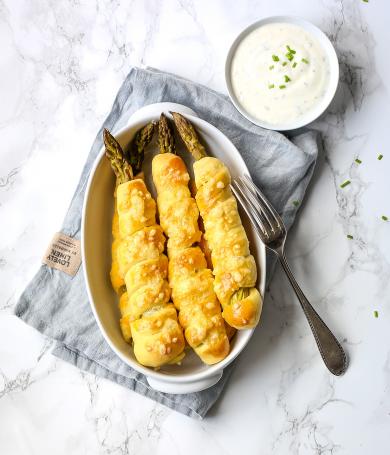 Normalerweise gebe ich Nudeln und Soße immer getrennt auf die Teller. Hier nicht. Hier seihe ich die Penne ab und vermenge sie direkt mit der Spargelsoße. Ein Tipp, den ich mir vom Reiser Kochteam abgeschaut habe. So können die Nudeln nämlich ganz viel von der cremigen Soße aufnehmen. Zum Schluss nur noch etwas Rucola on top – perfekt.