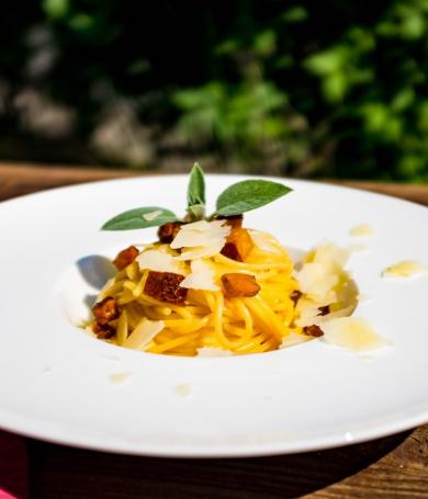 Es wird ja immer wieder behauptet, dass eine richtig gute Bolognese mehrere Stunden lang einkochen muss. Ob's stimmt? Das habe ich für dich bei meinem großen Bolognese-Special getestet. Hüpf mal rüber. Ich habe mich bei meiner veganen Linsenbolognese für die kürzere Variante entschieden. Tut dem Geschmack keinen Abbruch. Und soll ja auch immer noch ein Feierabend-Rezept bleiben. Nach einer Stunde Köchelzeit ist sie also fertig und kann zur Pasta serviert werden. Übrigens koche ich dazu Tagliatelle. Also bleibe auch hier klassisch. Warum keine Spaghetti? Na, weil das Original auch nicht mit jenen Nudeln serviert wird. An der glatten, schlanken Pasta bleibt nämlich kaum Soße hängen. Spaghetti sind die eingedeutschte Variante dazu.