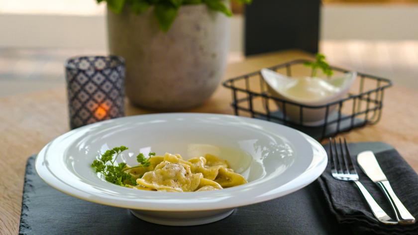 Egal ob Pelmeni, Piroggi, Ravioli oder Maultaschen – ich liebe gefüllte Teigtaschen! In brauner Butter geschwenkt, mit Soße oder einfach nur in Brühe gezogen... für mich gibt es kein schöneres Essen zum Entschleunigen und Runterkommen im Alltag. Nudeltaschen brauchen ja auch ein wenig Zeit. Allein die Zubereitung des Teiges und das dünne Ausrollen kann schon mal eine halbe Stunde in Anspruch nehmen. Dann noch eine schmackhafte Füllung zubereiten und die Taschen ausstechen, füllen und noch garen... Klar, es gibt schnellere Hungerlochfüller. Aber gerade in der dunklen Jahreszeit kann man sich ruhig mal wieder etwas mehr Zeit für sich nehmen. So wird das Kocherlebnis zum Hygge-Moment. Also, probier ruhig mal die pikant gefüllten russischen Pelmeni des Reiser-Kochteams aus, wenn Du Dir ein bisschen entspannte Küchenzeit nehmen möchtest. Du wirst es nicht bereuen!