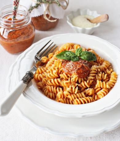 Nachdem die Vorbereitung fix erledigt ist, geht’s direkt weiter mit der Zubereitung. Und die ist mindestens genauso leicht, wie ein Pestoglas aufzuschrauben. Einfach Knoblauch mit Tomatenmarkt anbraten und mit Sahne ablöschen. Anschließend Tomaten, Schmelzkäse sowie Gewürze unterrühren und alles köcheln lassen. Falls du keinen Schmelzkäse hast, kannst du auch Frischkäse nehmen. Wenn du magst, auch einen mit Gartenkräutern. Das passt ganz gut zu den Tomaten. Nach 15 Minuten Köchelzeit ist die Tomaten-Mozzarella-Soße so gut wie fertig. Apropos Mozzarella: Der hat jetzt seinen großen Auftritt. Also Tomaten-Sahne-Mischung pürieren, mit Stärke kurz andicken lassen und den Mozzarella unterrühren. Ich zupfe ihn dafür in kleine Stücke. Dadurch schmilzt und verteilt er sich noch besser in der Soße. Falls du zwischendurch mal Lust auf superwürzig statt cremig hast, kann ich dir noch meine Puttanesca oder Arrabbiata Soße ans Herz legen.