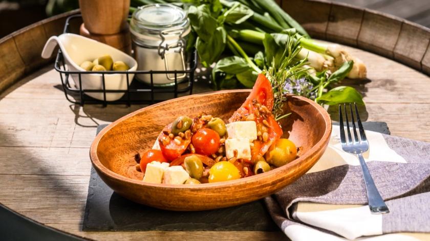 Was sonst noch in den Salat kommt? Ein paar Oliven und richtig gutes(!) Olivenöl. Mehr nicht. Wenn du richtig gute Tomaten erwischst - ja ich weiß, hierzulande nicht so einfach - braucht es auch überhaupt nicht mehr. Am besten du greifst zu einer bunten Mischung. Schmeckt nicht nur gut, sondern sieht auch noch gut aus.