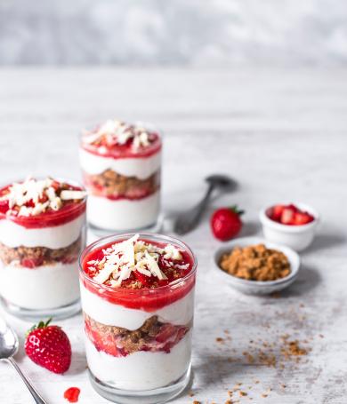 Fehlt nur noch die 4-Zutaten-Creme für den Trauben-Cookie-Nachtisch. Die habe ich beim Reiser Kochteam entdeckt und sofort übernommen. Die Basis ist Quark, der mit Zucker und etwas Zitronensaft glatt gerührt wird. Für noch mehr Cremigkeit sorgt aufgeschlagene Sahne. Alternativ kannst du auch Joghurt dazugeben. Jetzt müssen Cookies, Creme und Trauben nur noch im Glas übereinandergeschichtet werden. Fertig ist das einfachste Trauben-Cookie-Dessert.