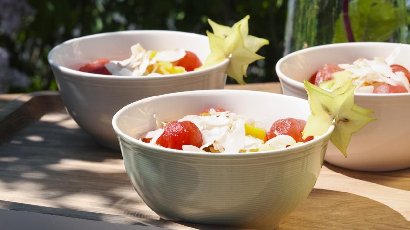 Den Obstsalat mit Sternfruchtscheiben garnieren und kurz vor dem Servieren mit den Kokoschips bestreuen.