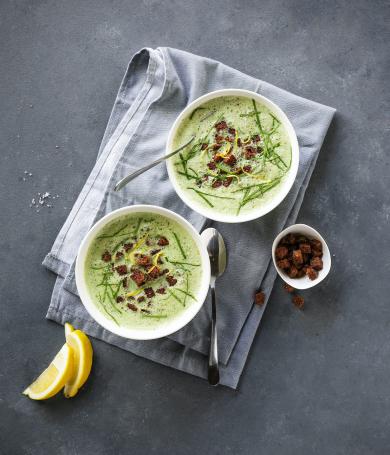 Bärlauchsuppe mit Frischkäse und Vollkorncroûtons