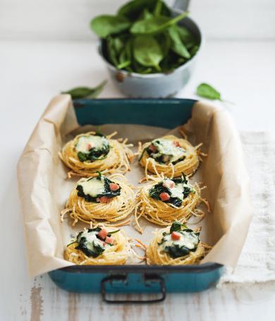 Knusprige Spaghetti-Spinat-Nester mit Käse