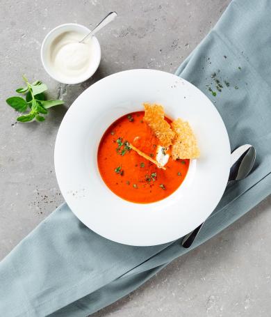 Tomaten-Paprika-Suppe mit Parmesanchips