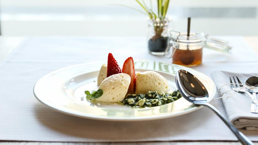 Weiße Mousse au Chocolat mit marinierten Erdbeeren und süßem Minz-Pesto