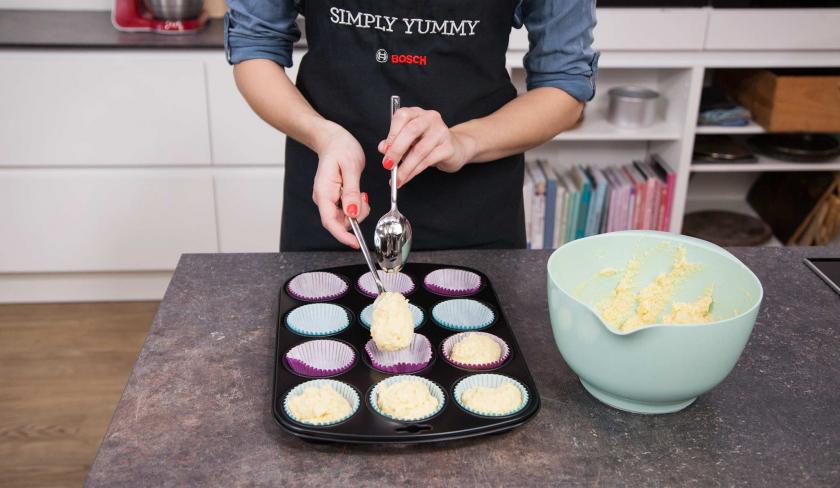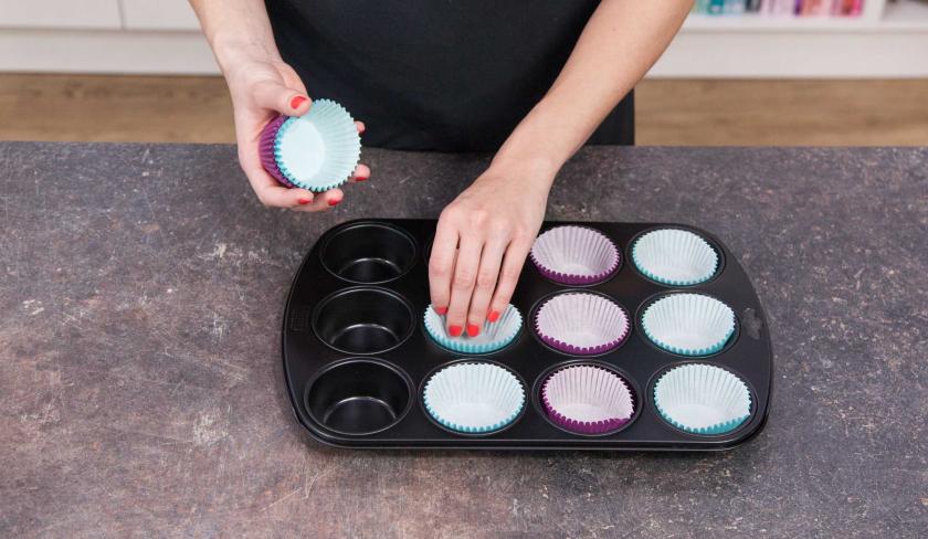 Heize den Backofen auf 170 °C Ober-/Unterhitze vor. Lege die 12 Mulden eines Muffinblechs mit Papierförmchen aus.