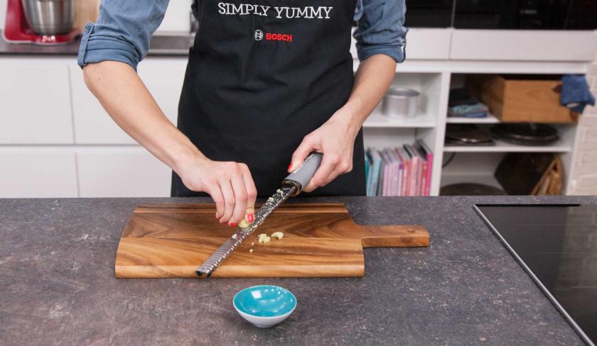 Schäle den Ingwer und zerreibe ihn sehr fein.