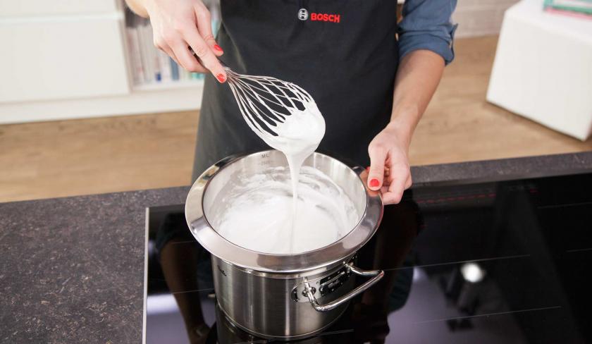 Schlage für das Topping das Eiweiß mit dem Salz über dem heißen Wasserbad fest auf, gib dann nach und nach den Zucker zu und schlage so lange weiter, bis die Masse schön glänzt. Nimm die Masse vom Wasserbad und rühre den Malibu unter.