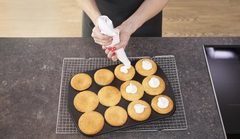 Besonderes Zubehör: Muffinblech (12 Mulden), 12 Papierförmchen, Sparschäler, Küchenreibe, 2 Rührschüsseln, Handrührgerät, Esslöffel, Wasserbad, Spritzbeutel mit kleiner Lochtülle, Küchengasbrenner