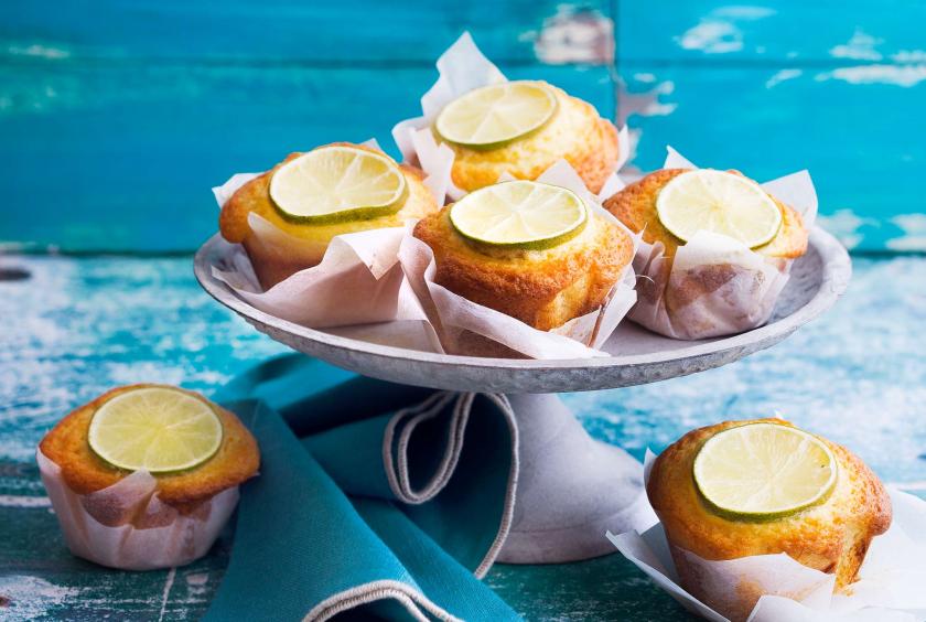 Fülle den Teig in die vorbereiteten Muffinförmchen und setze auf jeden Muffin 1 Limettenscheibe. Gib das Blech für 20-25 Minuten mittig in den Backofen.
