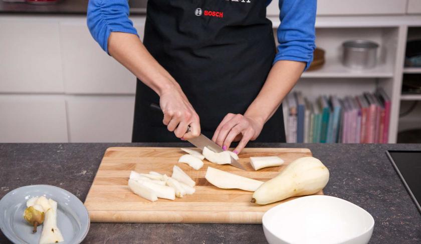 Schäle die Birnen, viertle und entkerne sie und schneide sie in schmale Spalten. Rasple das Marzipan auf der Küchenreibe in grobe Stücke. Es lässt sich besser reiben, wenn du es 1 Stunde zuvor in den Tiefkühlschrank legst.