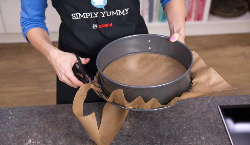 Heize den Backofen auf 175 °C Ober-/Unterhitze vor. Lege den Boden einer Springform mit Backpapier aus, fette den Rand mit etwas Butter ein.