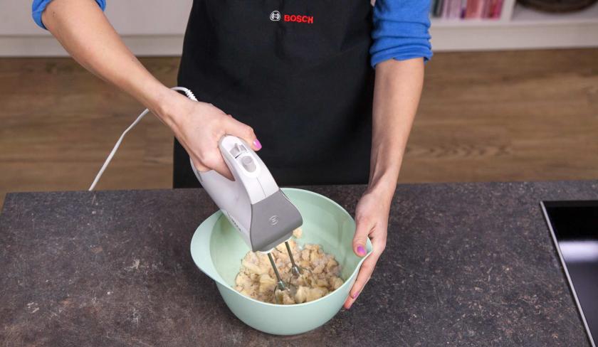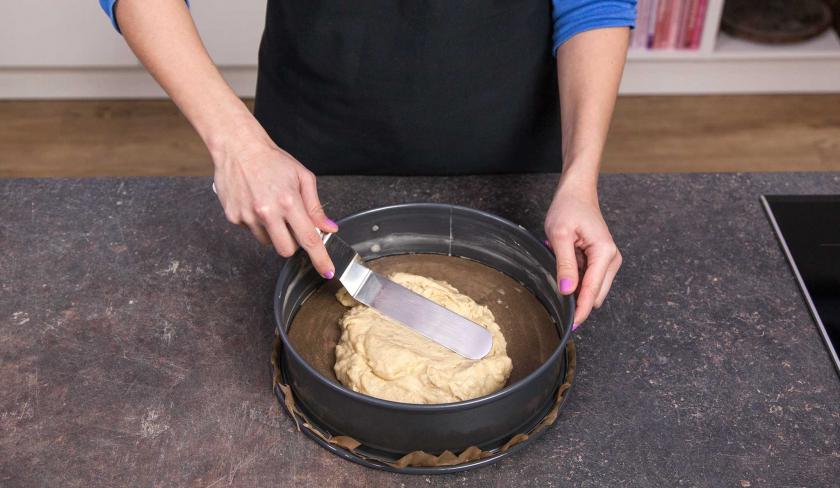 Gib dann die Milch dazu und verarbeitete alles zu einem Teig. Fülle den Teig in die Form.