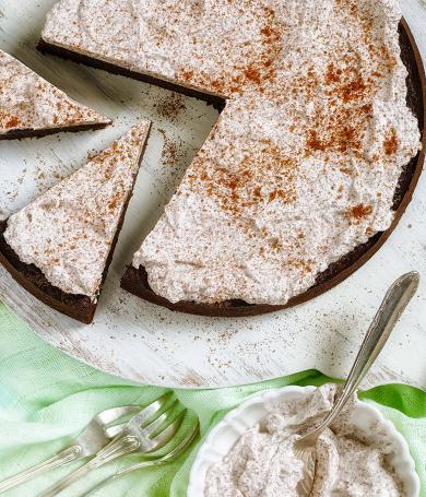 Die üppige Sahne-Schmand Haube auf der Tarte rundet den Kuchen ab, ähnlich wie die Milchschaumhaube auf einem Café au Lait. Du kannst ihn aber auch pur genießen oder mit etwas Puderzucker bestäuben – je nachdem wie Du Deine Mokka-Schoko-Tarte am liebsten magst.