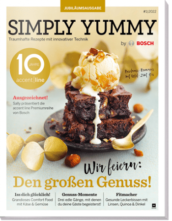 Kochen, genießen und mit der Familie und Freunden an einem Tisch kleine und große Momente erleben. Mit den Hausgeräten von Bosch eröffnen sich dir grandiose Genusswelten und ganz neue Möglichkeiten. Lade dir hier die exklusive Simply Yummy Jubiläumsausgabe kostenlos herunter, in der wir 10 Jahre accent line mit dir feiern möchten. Entdecke neue Lieblingsrezepte, die leicht, abwechslungsreich und einfach gekocht sind. Probiere zart schmelzende Naschereien, mit denen du glänzen kannst und garantiert begeisterst. Verwandele deine Küche mit unserem Feinschmecker-Menü in ein Sternerestaurant. Dabei unterstützen dich die Bosch Hausgeräte – du wirst staunen, wie leicht dir damit alles gelingt. Freu dich auf tolle Inspirationen. Wir wünschen dir viel Spaß beim Entdecken, Kochen und Genießen!