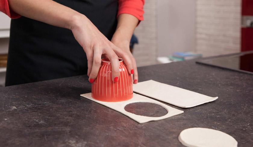 Lege die Blätterteigplatten auf eine Arbeitsplatte und lass sie auftauen. Stich nun aus jeder Platte je 2 Kreise aus.
