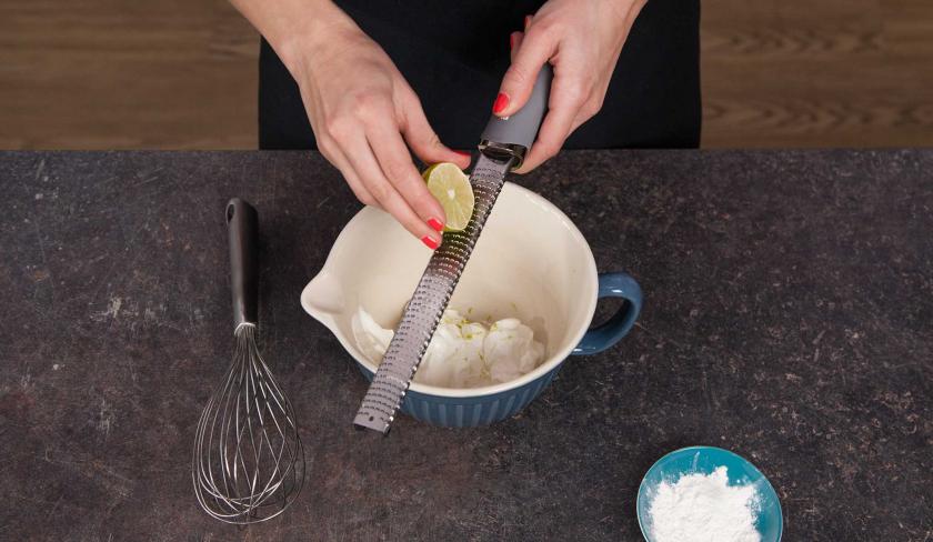 Vermische den Quark mit Limettenschale, Vanillearoma, Zucker und Puddingpulver.