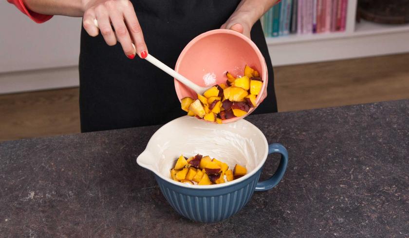 Wasche die Pfirsiche, halbiere sie, entsteine sie und schneide sie dann in kleine Würfel. Diese mischst du nun unter die Quarkcreme.