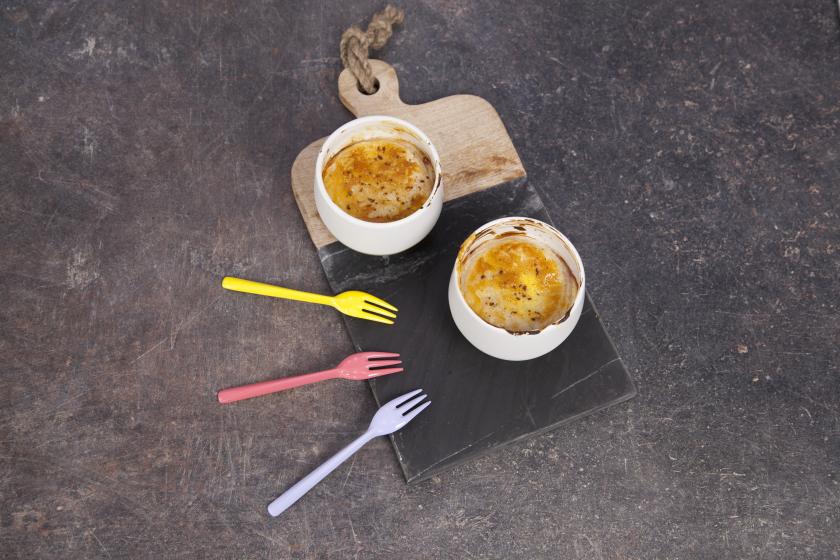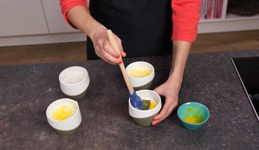 Besonderes Zubehör: Ausstechförmchen oder Becher (ca. 8 cm Durchmesser), 4 ofenfeste Tassen oder Auflaufförmchen (Inhalt ca. 200 ml), Rührschüssel, Schneebesen, Schneidebrett, Messer, Esslöffel, kleines Schälchen, Gabel, Pinsel