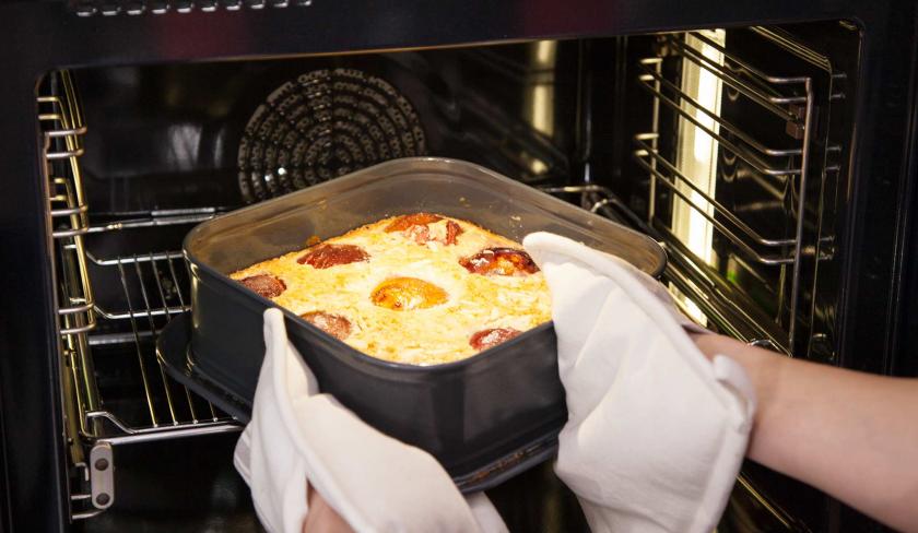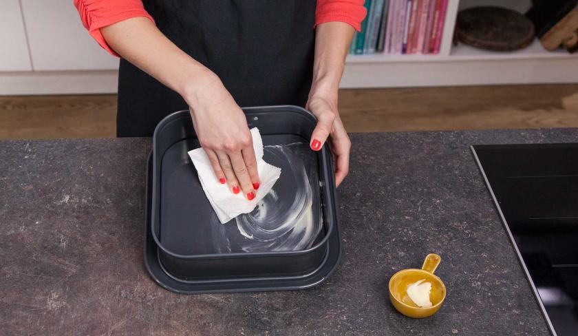 Besonderes Zubehör: Eckige Back- oder Auflaufform (24 x 24 cm), Küchenpapier, Schneidebrett, Messer, 2 Rührschüsseln, Handrührgerät, Teigschaber, Holzstäbchen, kleine Schale