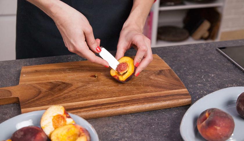 Wasche die Pfirsiche und tupfe sie trocken. Halbiere sie und entferne den Stein.