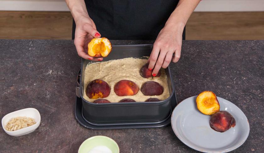 Gib den Teig in die Form und streiche ihn darin glatt. Lege nun die Pfirsichhälften mit der Schnittfläche nach unten dicht an dicht darauf und drücke sie leicht in den Teig, bestreue sie dann mit etwas Zucker und den Mandelstiften.