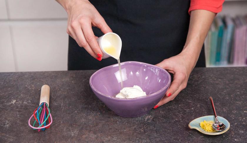 Verrühre Schmand mit Zitronenschale, Zitronensaft sowie Zucker.