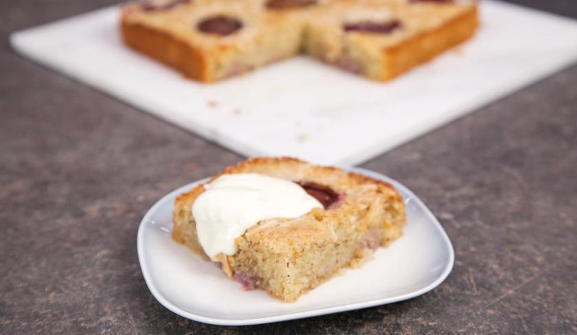 Für den Teig Mehl mit Backpulver und Salz in eine kleine Schüssel sieben, dann vermischen und beiseitestellen. Schlage die Butter mit Zucker schön cremig, gib die Eier einzeln dazu. Schmand und Zitronenschale unterrühren, dann die Mehlmischung sowie die gemahlenen Mandeln unterziehen.