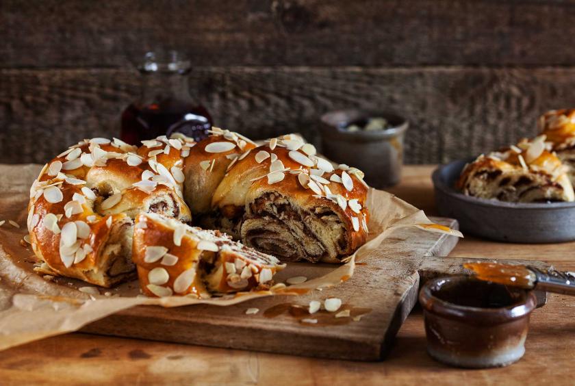 Keine Kaffeeklatsch ohne Hefekranz! Vor allem wenn er ein so köstliches geflochtenes Meisterwerk wie dieser ist! Lockerer Hefeteig gefüllt mit knusprigen Haselnüssen, zart schmelzender Schokolade und süßem Marzipan, gekrönt mit einem Hauch von Amaretto – was braucht man mehr?