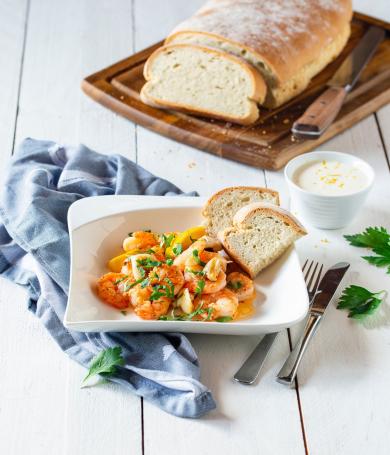 Knoblauchgarnelen mit Blitzbrot und Zitronen-Mayo