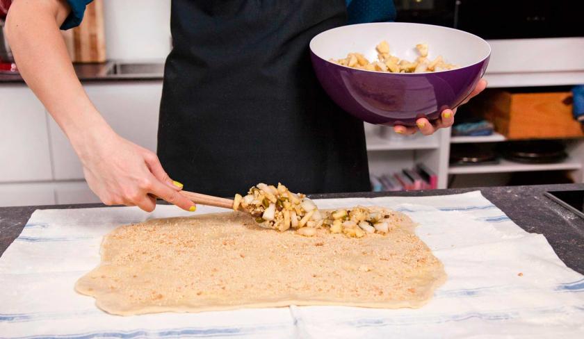 Verteile nun die Obstmischung auf dem Teig. Lass dabei kleine Ränder, damit der Strudel sich gut schließen lässt.