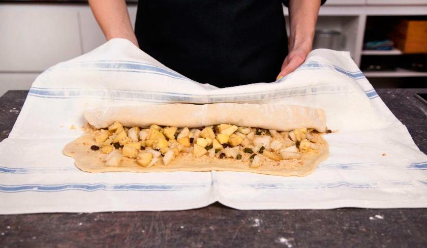 Rolle den Teig von der breiten Seite her fest auf, drücke die Öffnung gut zu und schlage die Enden vorsichtig unter den Strudel. Lege den Strudel mit der Naht nach unten auf ein mit Backpapier belegtes Backblech.